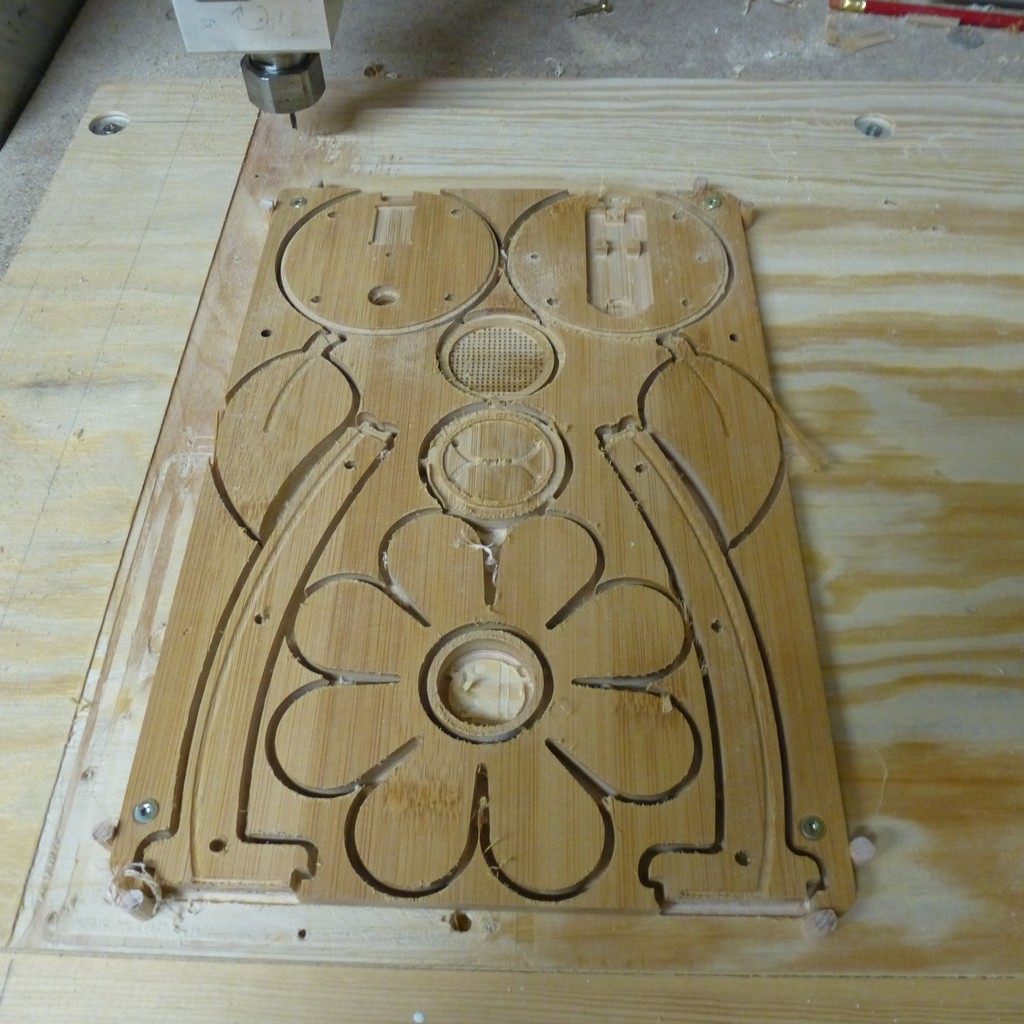 Also flugs das CAD Programm angeworfen und drauflos gezeichnet und ein NC Programm erzeugt. Als Material kam ein Küchenbrett aus Bambus zum Einsatz (Holz kann man ja in ordentlicher Qualität nicht mehr kaufen)