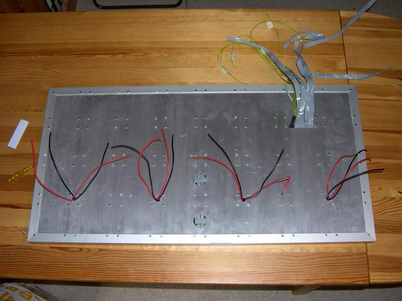 Die Wärmeentwicklung der LEDs ist zwar beachtlich, aber noch im Rahmen. Gut, daß die LED Module auf ein Alublech geschraubt sind, das wirkt dann als recht riesiger Kühlkörper.