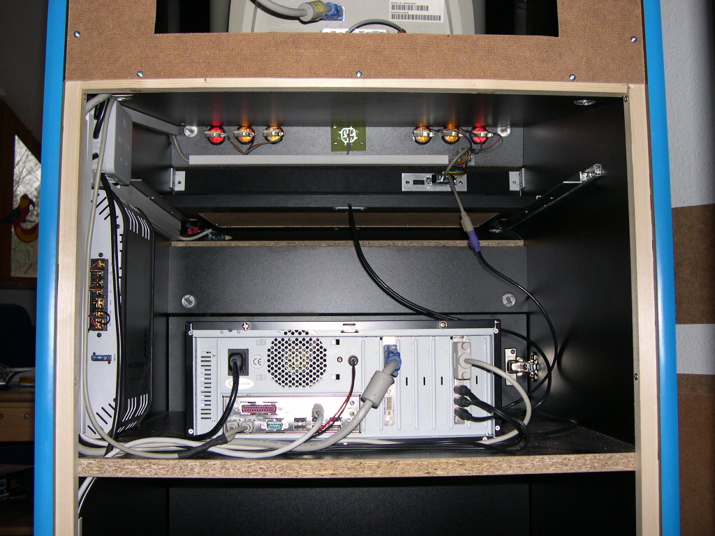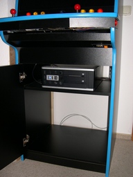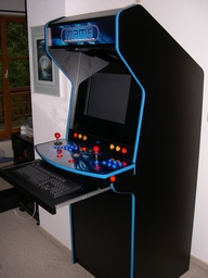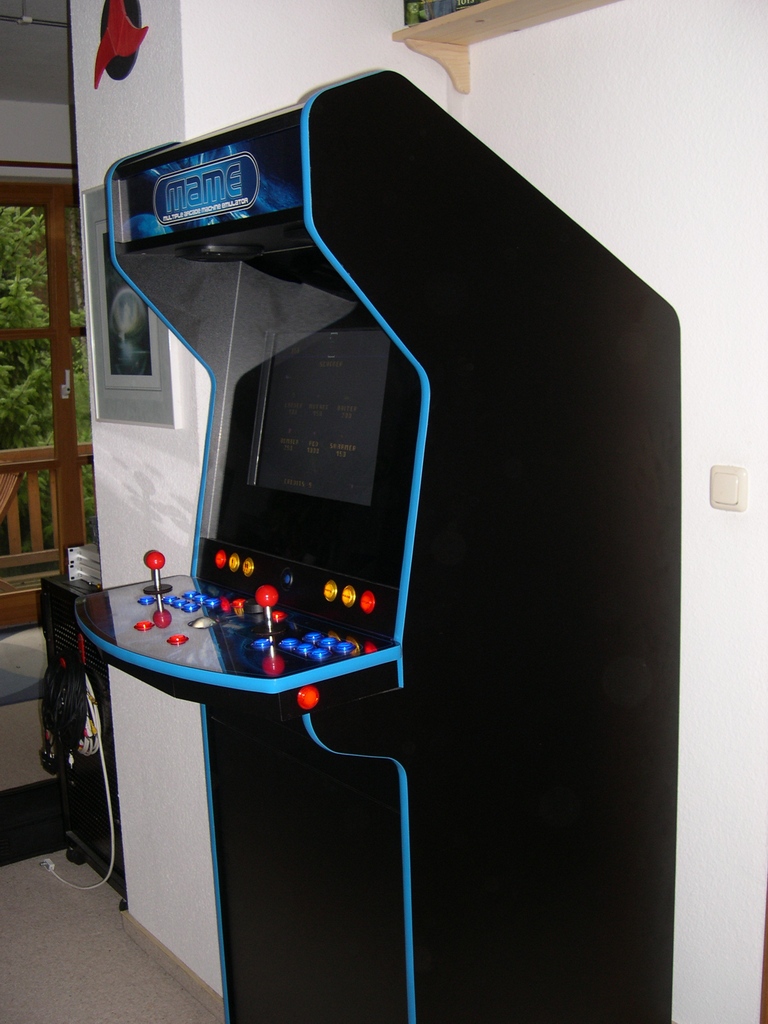 Nun ist es ja nicht sehr stilecht sowas am Schreibtisch mit PC-Tastatur oder Gamepad zu spielen, so war die Idee geboren einen Arcadeautomaten nachzubauen. Man nehme ein paar Spanplatten, einen (alten) PC, einen alten Monitor, einen Berg Taster und Joysticks. Mit ein bischen handwerklichem Geschick wird daraus dann ein Automat der ähnlich aussieht wie die Dinger die früher in den Spielhallen rumstanden und einem das Taschengeld aus den Taschen gesaugt haben.