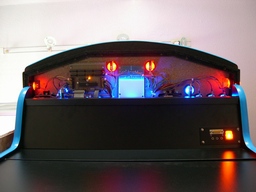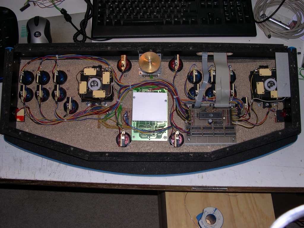 Nun fehlt das Bedienteil. Da ich ja einen Leuchtfetisch habe, sollten die Tasten leuchten. Ich fand bei EBay einen Sack voll transparenter Arcadetasten, da hab ich dann LEDs reingefriemelt und das ganze dann an einen selbstgestrickten Controller gehängt der eine PS/2-Tastatur simuliert und zusätzlich die LEDs ansteuern kann. Dazu kam dann noch ein alter Serialtrackball, den ich an eine Platine einer PS/2 Maus drangstrickt habe. Ebenso der Spinner. Ein Spinner ist ein Drehgeber, die alten Originalspinner liefen recht lange nach, was einfache Geber nicht tun, daher habe ich mir das Gerät selbstgemacht, aus einer Kunststoffplatte mit draufgeklebtem Ausdruck einer Streifenmaske, einer selbstgedrehten Schwungmasse und einer Doppellichtschranke aus o.g. Maus. Ob es eine gute Idee war, den Spinner ans Scrollrad der Maus zu hängen weiß ich noch nicht. Keine Ahnung ob MAME das unterstützt.